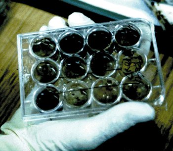 The next day, Beadle sent Delbruck a telegram written in a different four-letter code—one that lacked a space character. Delbruck soon solved the puzzle and read the note: "GWBTOMDIMSUREITSAFINEMESSAGEIFICOULDDOTHEFINALSTEP". Not one to be gainsayed, Delbruck conspired to get the final word. "As Beadle stepped up to the podium in Stockholm to receive his award from the king, a courier walked in," Davis narrates, his eyes widening. "He handed Beadle a ladderlike toothpick model, each rung stained in one of four colors. Beadle decoded the message on the spot," Davis says, his voice trailing to a whisper. "I AM THE RIDDLE OF LIFE. KNOW ME AND YOU WILL KNOW YOURSELF," read the toothpicks. "I found that so moving, so moving," Davis says. Inspired by the story, Davis worked out a logical code for translating the language of English into the language of life. (Delbruck's and Beadle's codes were arbitrary.) He cloned the DNA sequence representing the "Riddle of Life" quotation and sequestered it safely in a noncoding part of the E. coli genome. Then he sequestered the E. coli in a safe part of the Rich lab, where it has remained ever since. (The Riddle of Life organisms shown in Linz were created from scratch in Europe.) In a keynote lecture at the Ars Electronica exhibition, Davis described his most ambitious transgenic artwork yet: putting an image of the Milky Way into a mouse's ear, an idea inspired by a children's story written 30 years ago by a girlfriend. In order to encode such a large amount of binary information in DNA, he spent years figuring out a general method for archiving computer databases in biological form, a "supercode" that guarantees the infogene will be biochemically stable and yet prevents the host from translating it into protein.