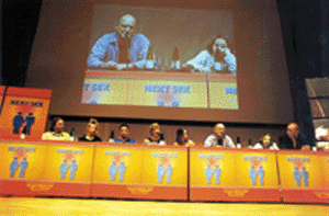 Digitized and translated into a string of 28 DNA nucleotides, Microvenus first slipped between the genes of E. coli in 1990. The bacteria quickly multiplied in its beakers into billions of cells, each carrying a separate instance of the icon. "I'm probably the most successful publisher in history," Davis says with a laugh. "There are more copies of my work than of Salvador Dali's, Escher's and all the rest of them put together." Without a doubt, Microvenus was the most highly reproduced graphic that almost no one had ever seen, because no gallery has been willing to risk the public display of genetically engineered bacteria in the U.S. It was not until last September that Microvenus was finally put on public display in a positive-pressure biological containment facility erected at the Ars Electronica exhibition in Linz, Austria. Visitors could see cultures of the transgenic bacteria along with posters of the icon and explanations of how and why the image was encoded into the E. coli genome. And it was at Linz that Davis was also able for the first time to exhibit Riddle of Life, a second genetic artwork he created in the mid-1990s. That project began when he learned about a classic rivalry in the history of genetics, between physicist Max Delbruck and biologist George W. Beadle. "This was back before they had worked out the code that matches 20 distinct triplets of DNA nucleotides to the 20 amino acids," Davis explains. "They didn't even know whether there were 'spaces' that separated each triplet." Delbruck believed DNA must contain spaces between its "words;" Beadle disagreed. In 1958 Beadle was awarded the Nobel Prize (as was Joshua Lederberg). On learning the news, Delbruck and his co-workers dashed off a telegram encoded as a continuous string of 229 As, Bs, Cs, and Ds. Beadle quickly surmised that the four letters symbolized the four bases of DNA, broke the telegram into triplets and decoded the message: "BREAK THIS CODE OR GIVE BACK THE NOBEL PRIZE LEDERBERG GO HOME MAX MARKO STERLING".